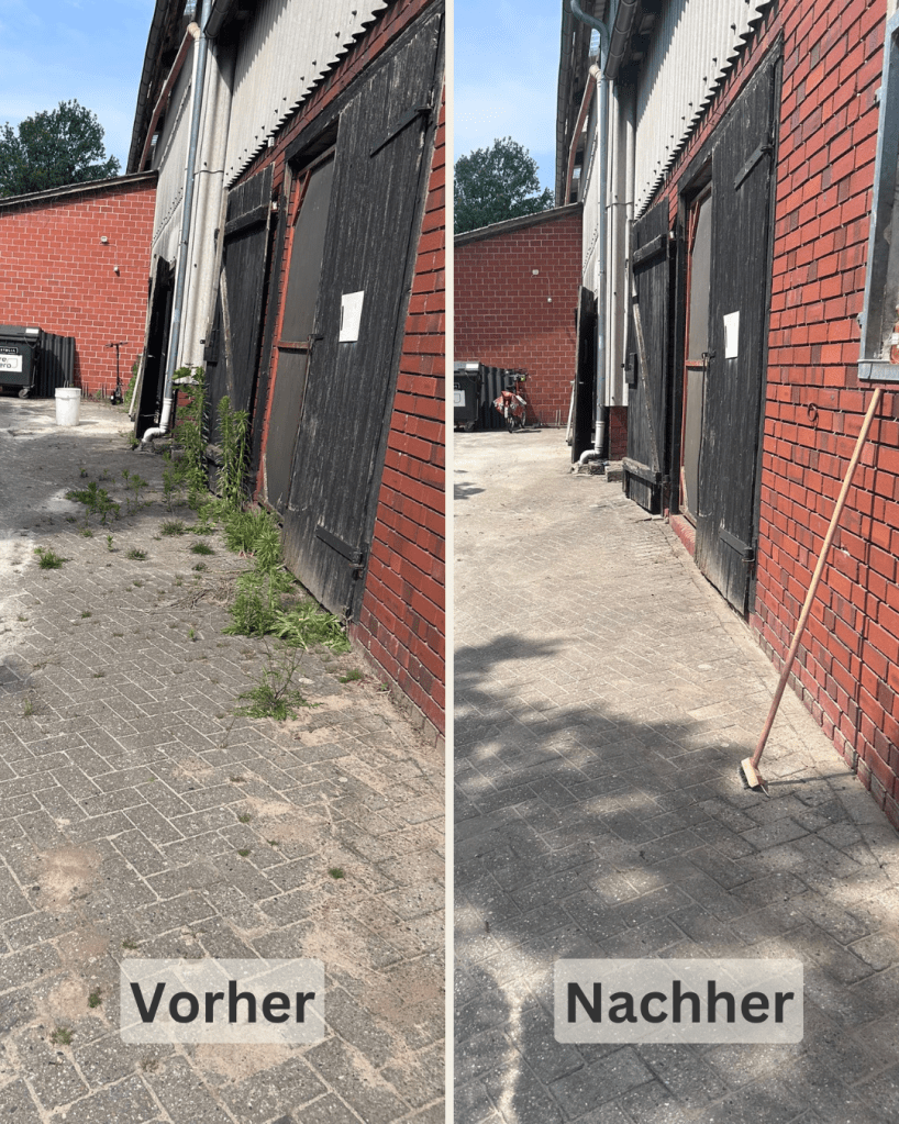 - das hartnäckige Grün in den Ecken des Außenplatzes zu entfernen